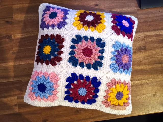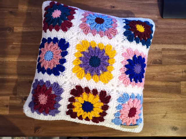 Dieses Grannysquare Kissen ist von mir handgefertigt und aus 100% Polyacryl Garn gehäkelt. Der gehäkelte Bezug ist an einen extra 100% Baumwoll-Kissenbezug genäht, somit sind diese zusammen abnehmbar und waschbar (bei 30 Gard).